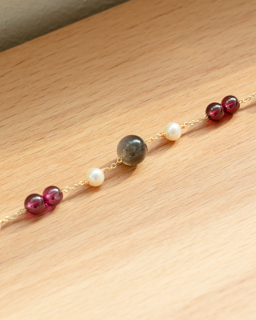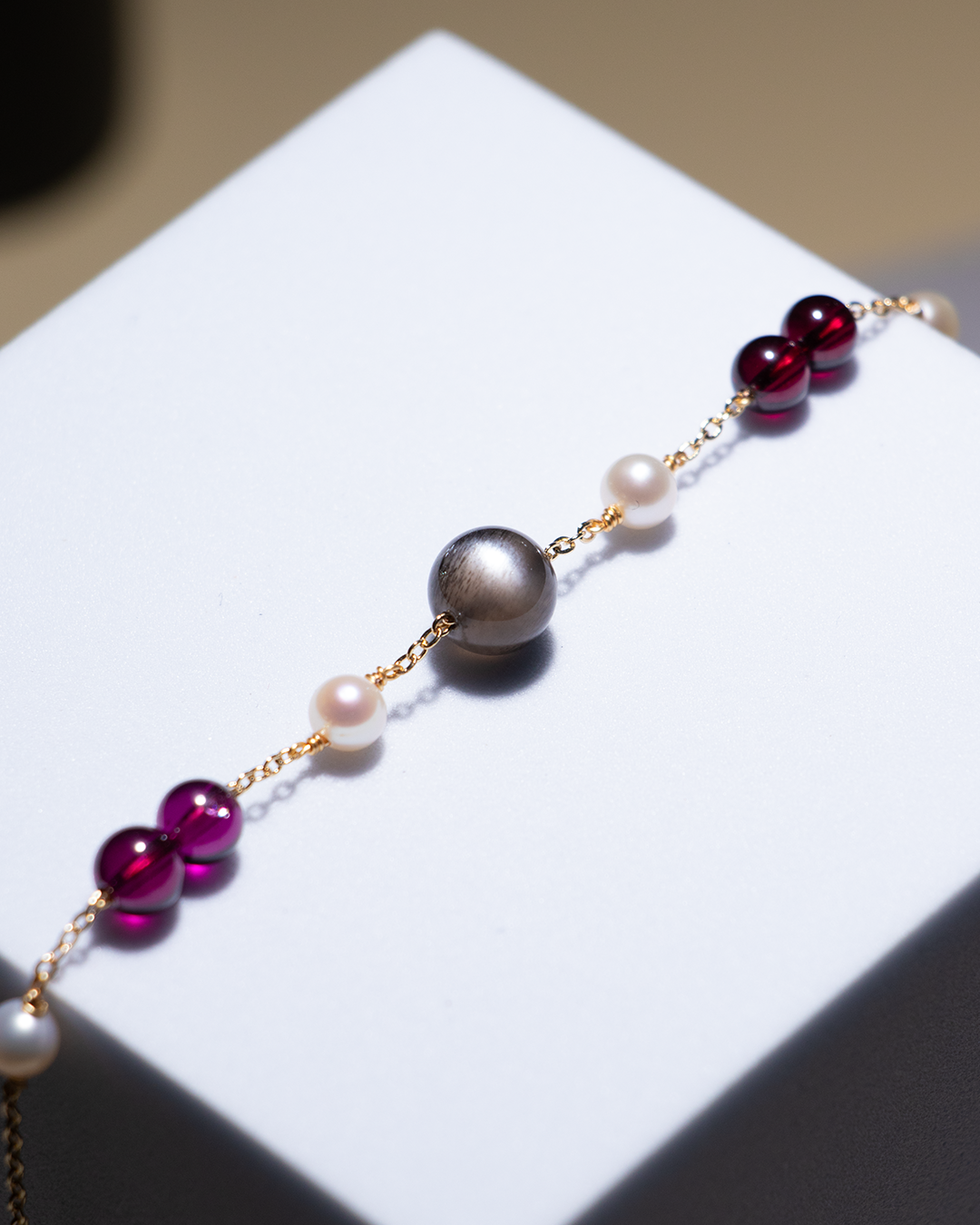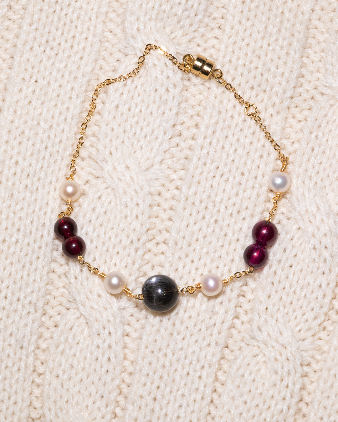 Black Skeletal Quartz anchors emotional clarity and grounded intuition. Pearl brings softness, reminding you of emotional maturity and self-composure. Purple Garnet, a rare violet-toned variant, blends Garnet’s courage with higher awareness — symbolising self-respect through discernment.