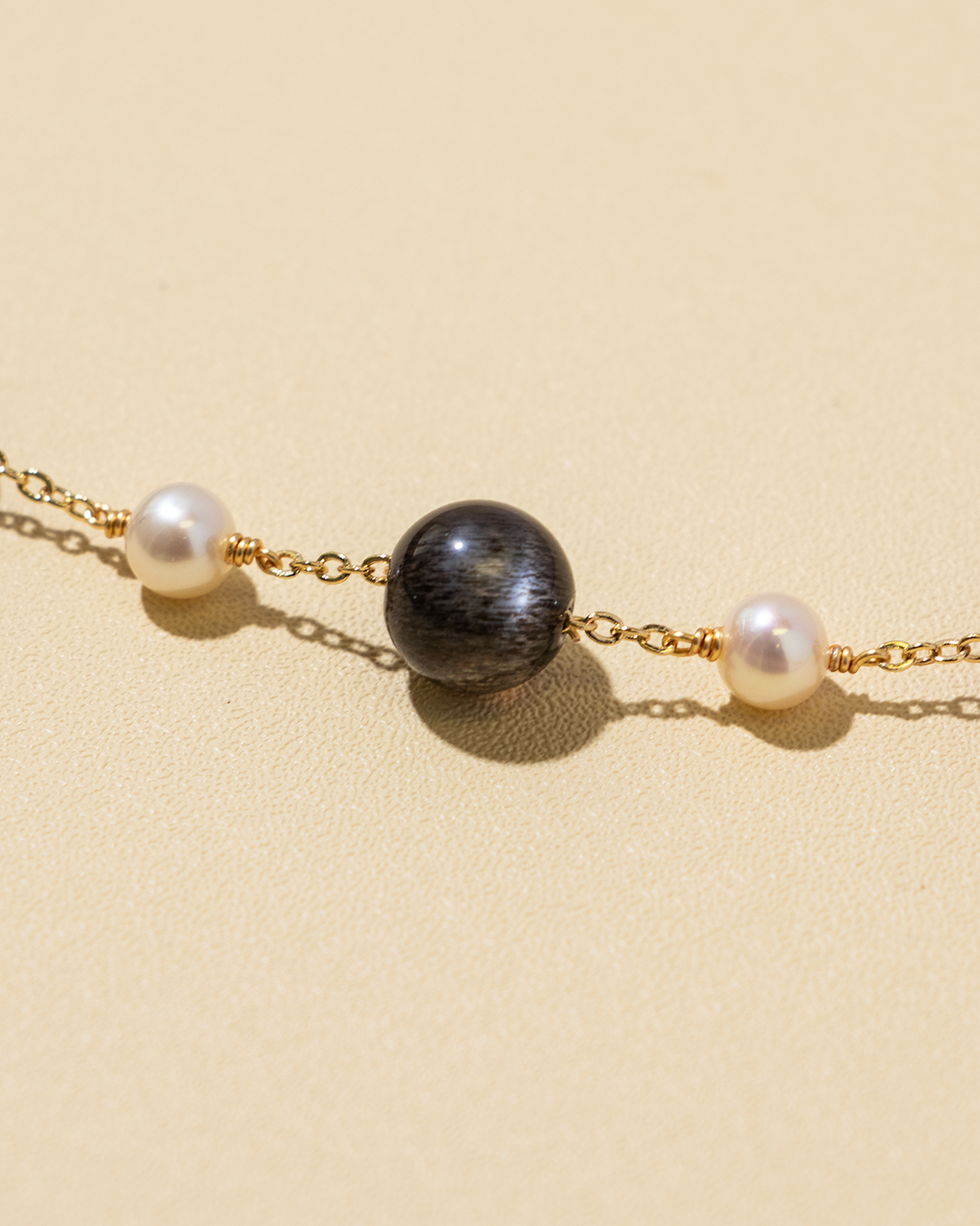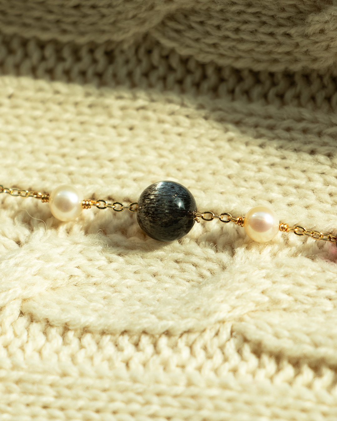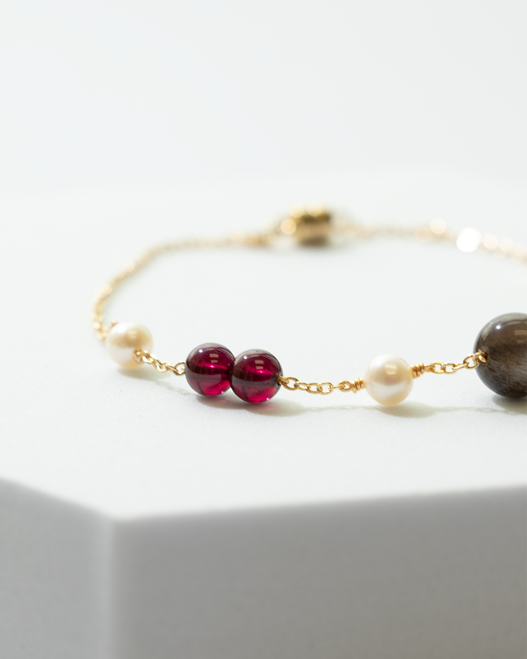 Black Skeletal Quartz anchors emotional clarity and grounded intuition. Pearl brings softness, reminding you of emotional maturity and self-composure. Purple Garnet, a rare violet-toned variant, blends Garnet’s courage with higher awareness — symbolising self-respect through discernment.