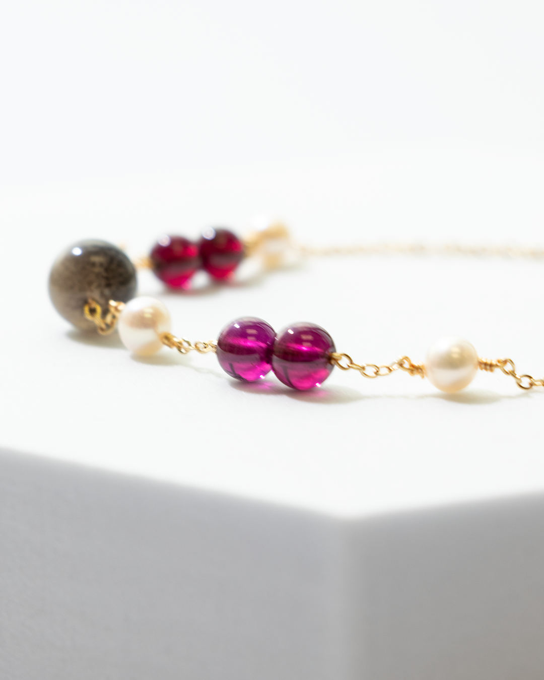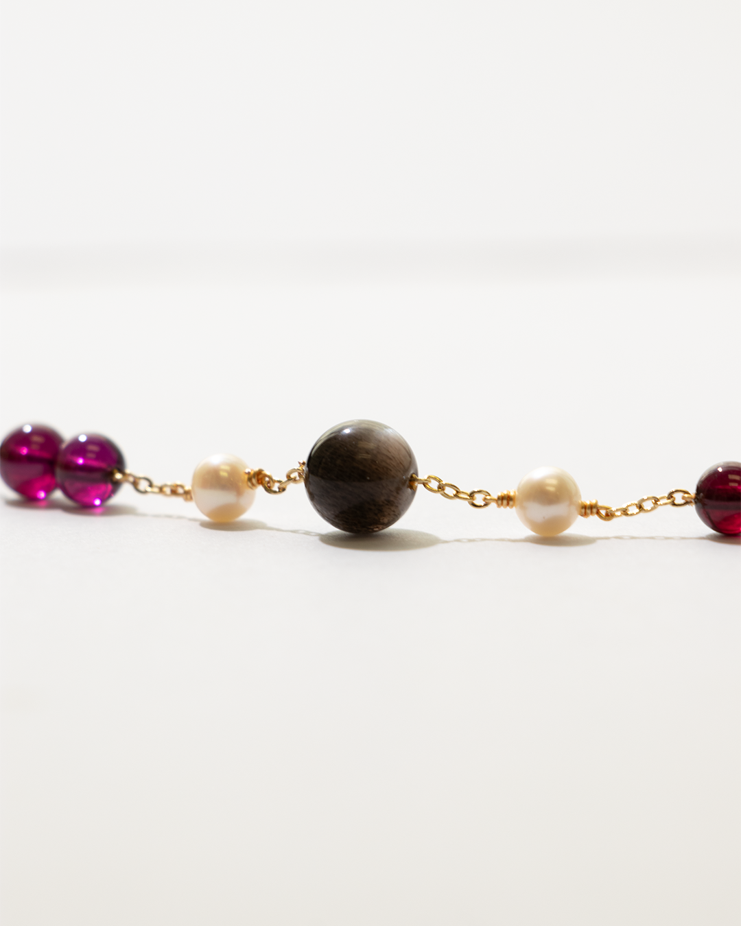 Black Skeletal Quartz . Pearl . Purple Garnet