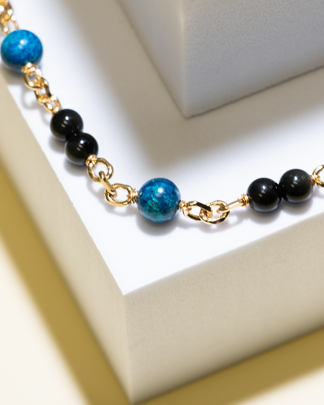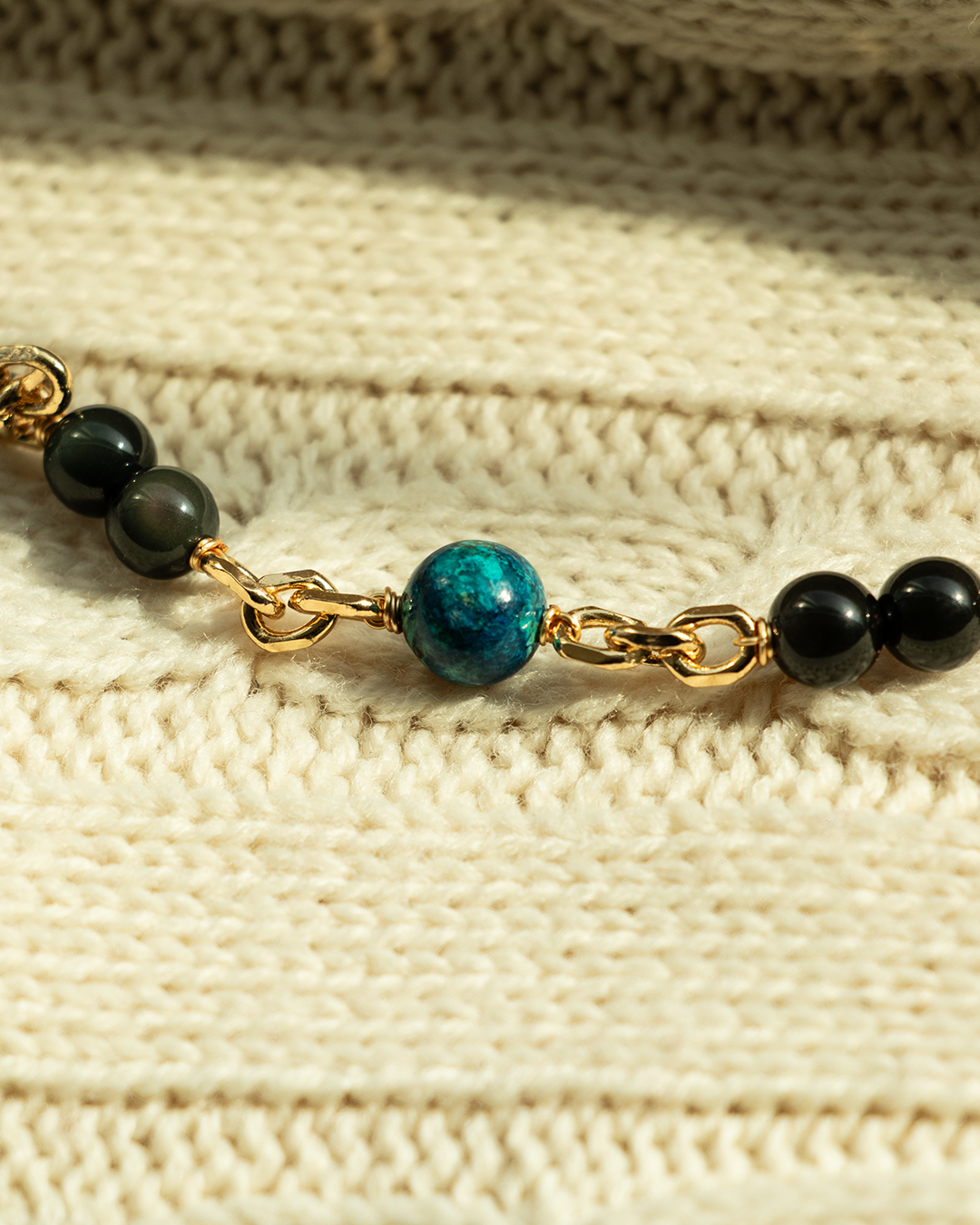 Made with genuine Rainbow Obsidian and Chrysocolla, accented in heavy-duty gold plating for daily resilience.