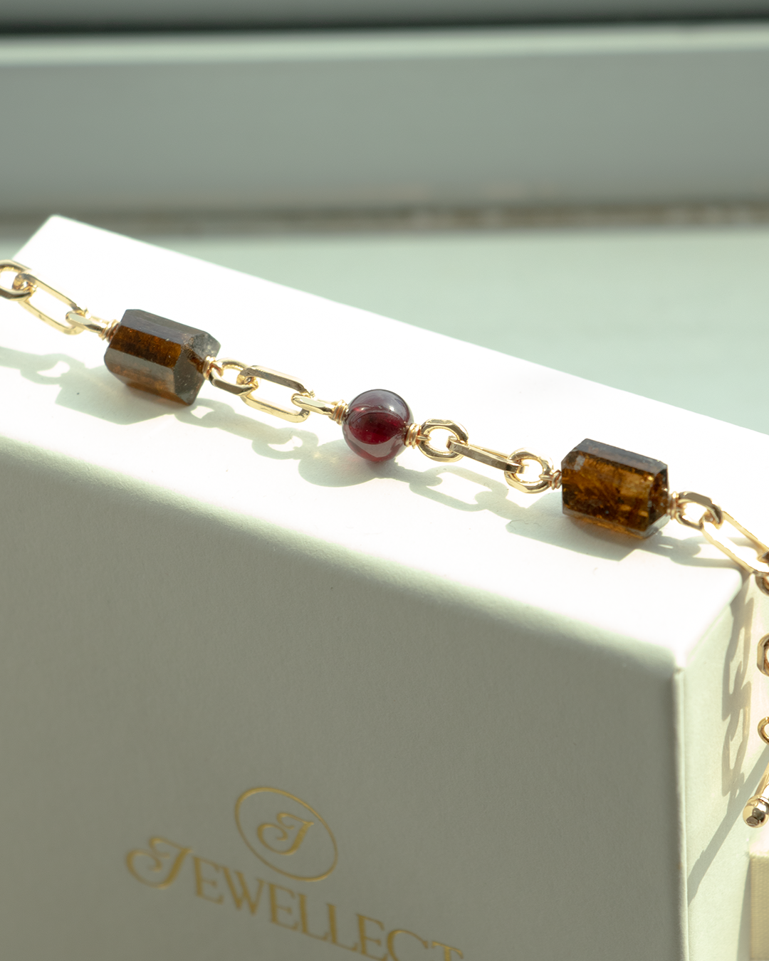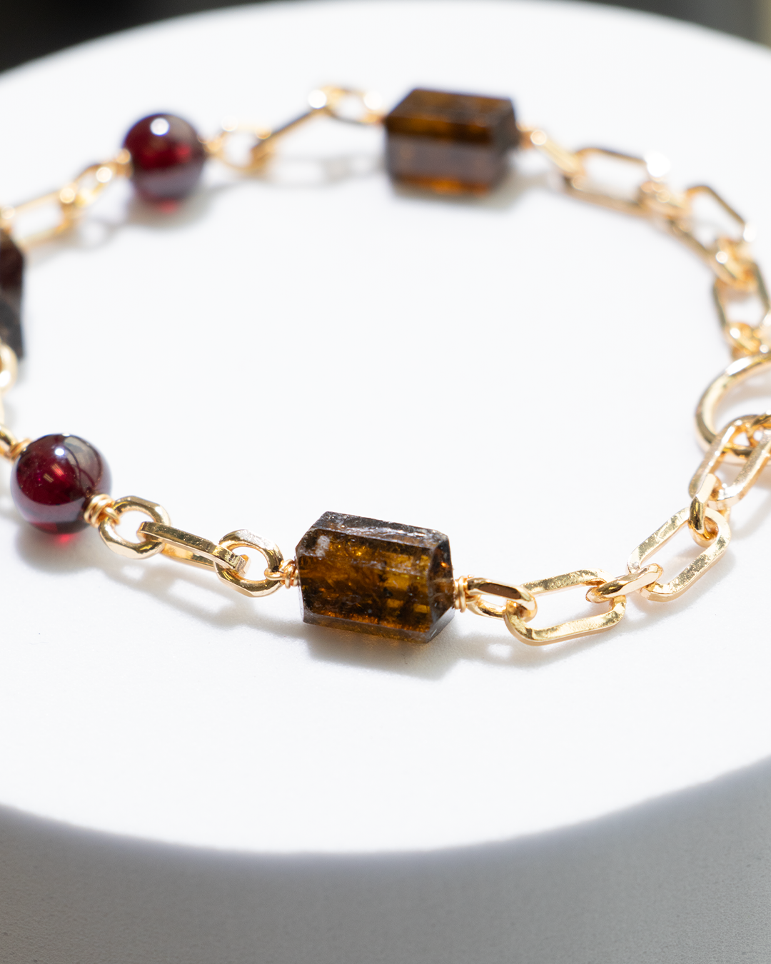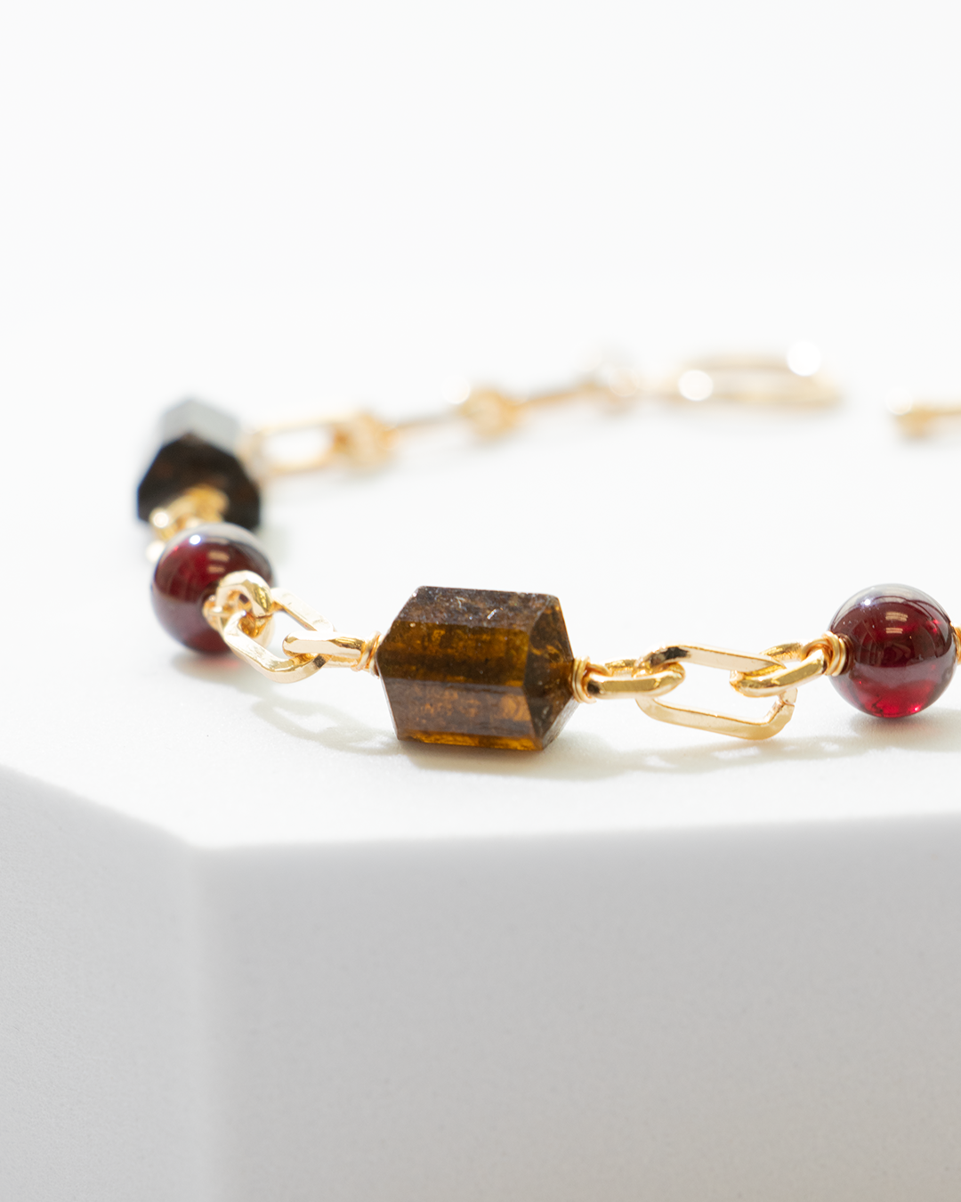 Featuring natural Black Gold Tourmaline and Almandine Garnet, finished with durable gold-plated accents for long-lasting wear.