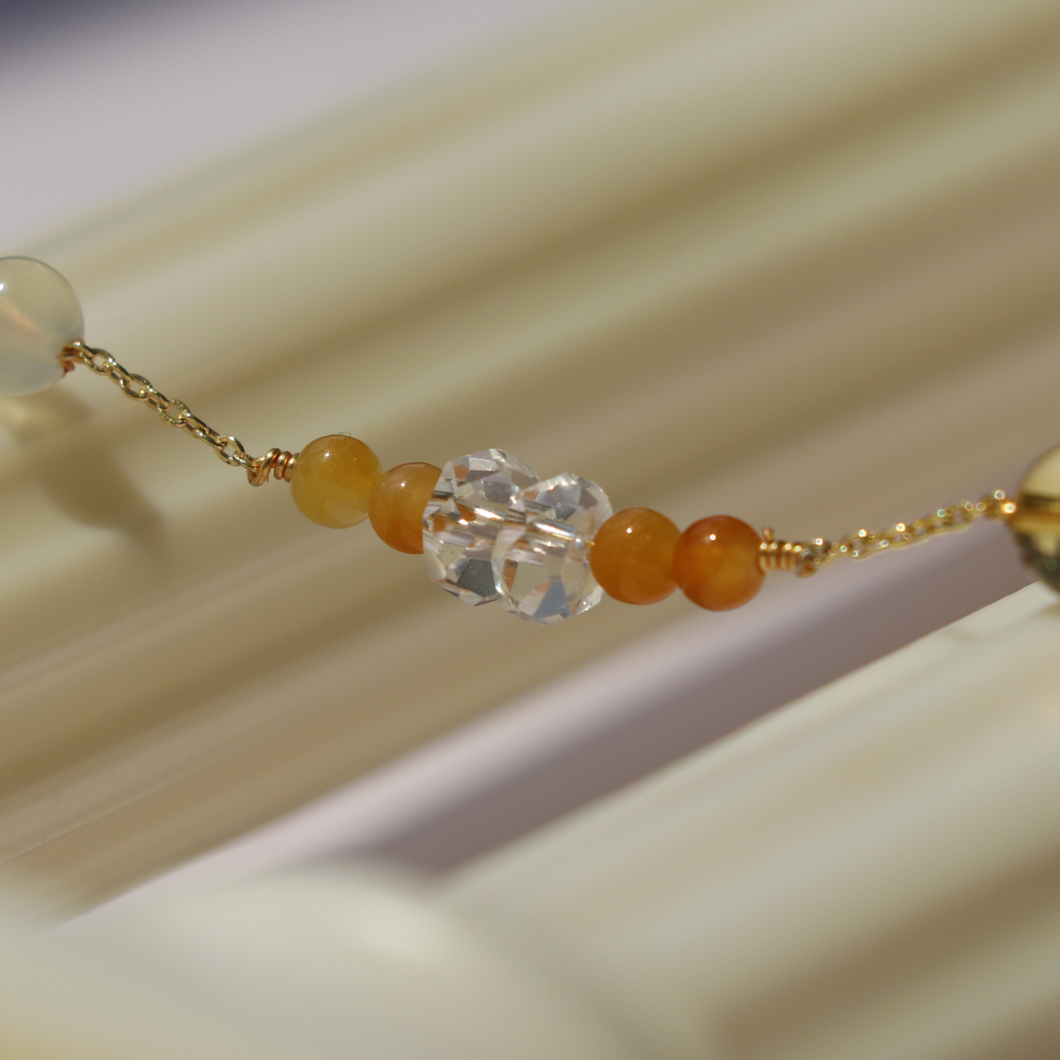 Joy doesn’t always arrive loudly — sometimes it’s a soft glimmer. Meadow Light brings warmth and clarity in equal measure. With radiant yellow jadeite, sunlit citrine, iridescent white moonstone, and a brilliant faceted clear quartz center — this bracelet is designed to brighten your day, gently. This piece was made for the days you want to feel fresh, uplifted, and quietly confident — like standing in warm morning light.